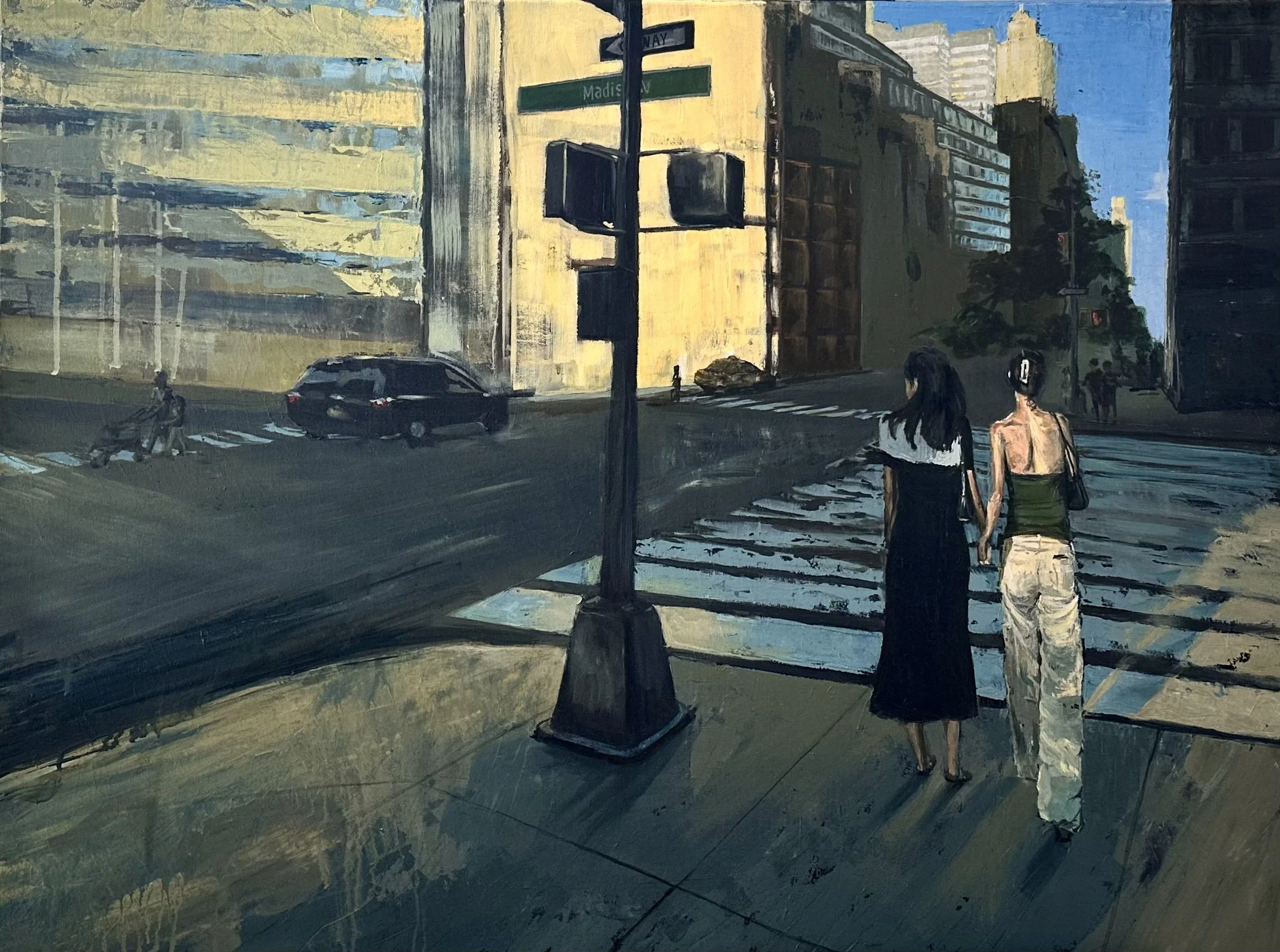 Acrylic painting of some friends at an east village gathering by Ezri White.